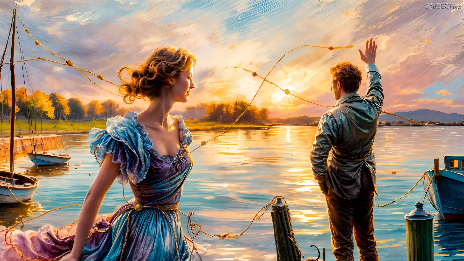 Grafika, Jezioro, Kobieta, Mężczyzna, Łódki, Zachód słońca - faceci.biz
